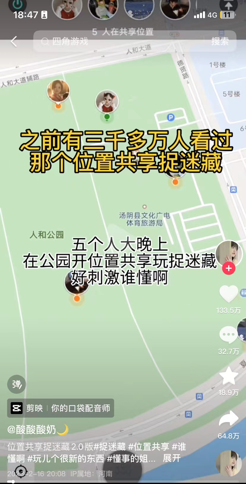 视频中,@酸酸酸奶 和四位朋友在公园里,利用微信共享定位功能捉迷藏。借助抖音巨大的流量池,这一看似简单粗糙的视频获得了192万次点赞和55万次评论。