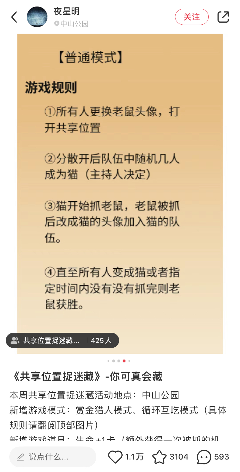 小红书用户@夜星明 早在3月8日就开始在小红书发布自己组织百人捉迷藏的聊天记录,并征集更多玩家加入。在更多人申请加入之后,他以小红书擅长的UGC攻略内容形式,总结了共享位置捉迷藏的普通玩法和升级玩法,成为躲猫猫在小红书第一轮传播中关注度最高的一条。