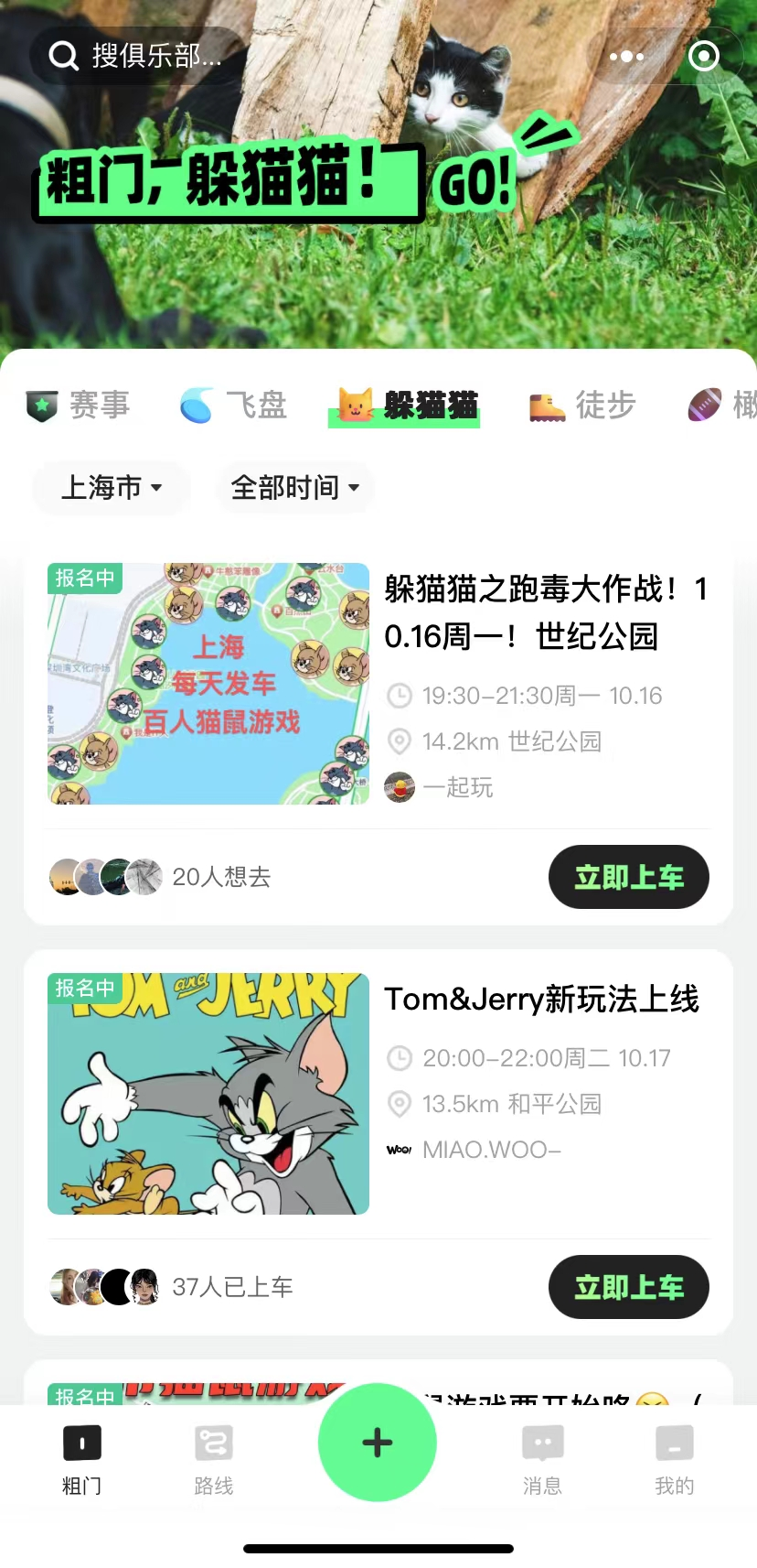 「粗门」给自己定义为社交潮流运动第一站。不少社群入驻后会在其中发布新活动信息。如今打开粗门,躲猫猫的玩法已经被放置在首页一级菜单中,仅次于飞盘这一玩法分支。