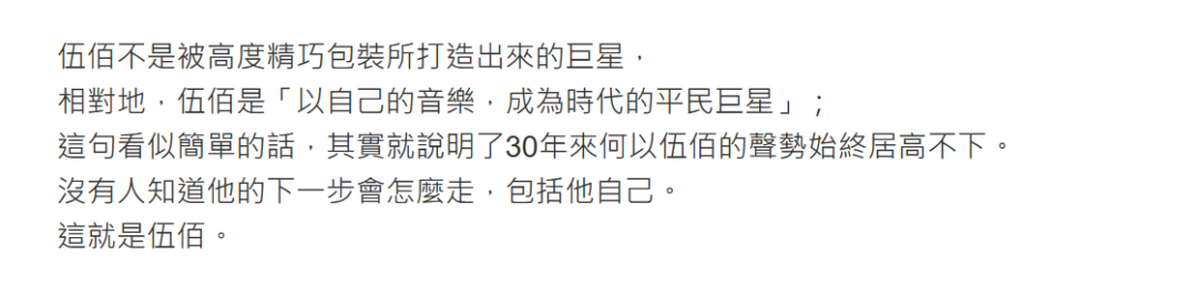 在伍佰官方网站上有这样一句话,伍佰不是被高度精巧包装所打造出来的巨星,相对地,伍佰是“以自己的音乐,成为时代的平民巨星”。