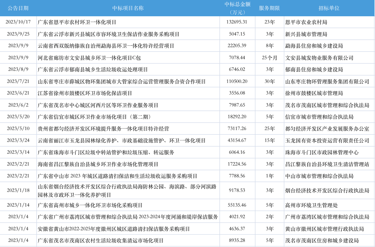 而整个行业项目合同总额呈同比增长态势。2022年上半年全国环卫服务中标项目合同总额1096亿元、年化额380亿元。2023年上半年,全国环卫服务中标项目合同总额1171亿元、项目成交年化总额430亿元,再创历史新高。