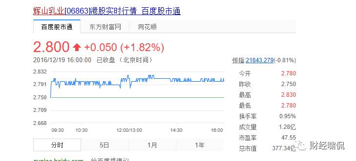 据统计,12月19日,辉山乳业股票价格不跌反涨,盘中涨幅一度达到2.18%;截止12月19日收盘,辉山乳业股票价格报收2.8元/股,上涨1.82%,基本稳住股价。