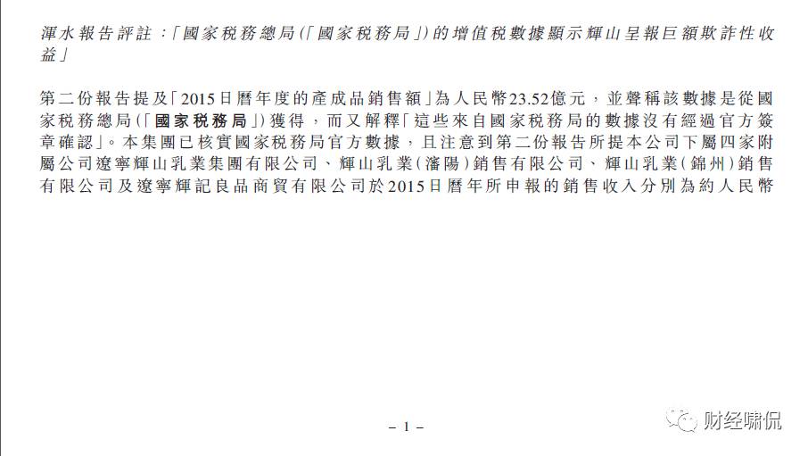 首先,浑水在第二份报告中称,从国家税务总局获的资料显示,辉山乳业2015年度的产成品销售收入23.52亿人民币,但同时,浑水在报告下方承认“这些来自国家税务总局的数据没有官方签章确认的”。