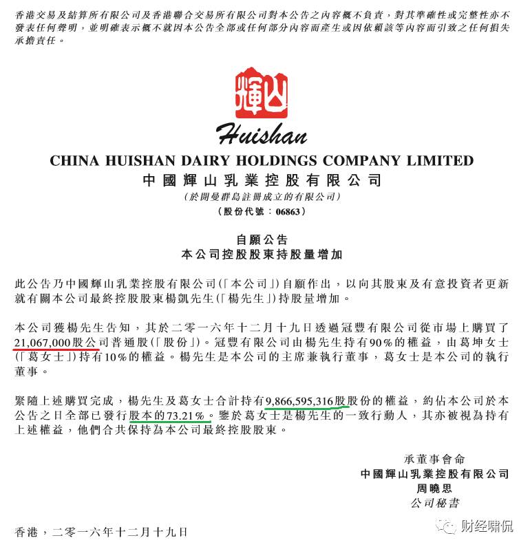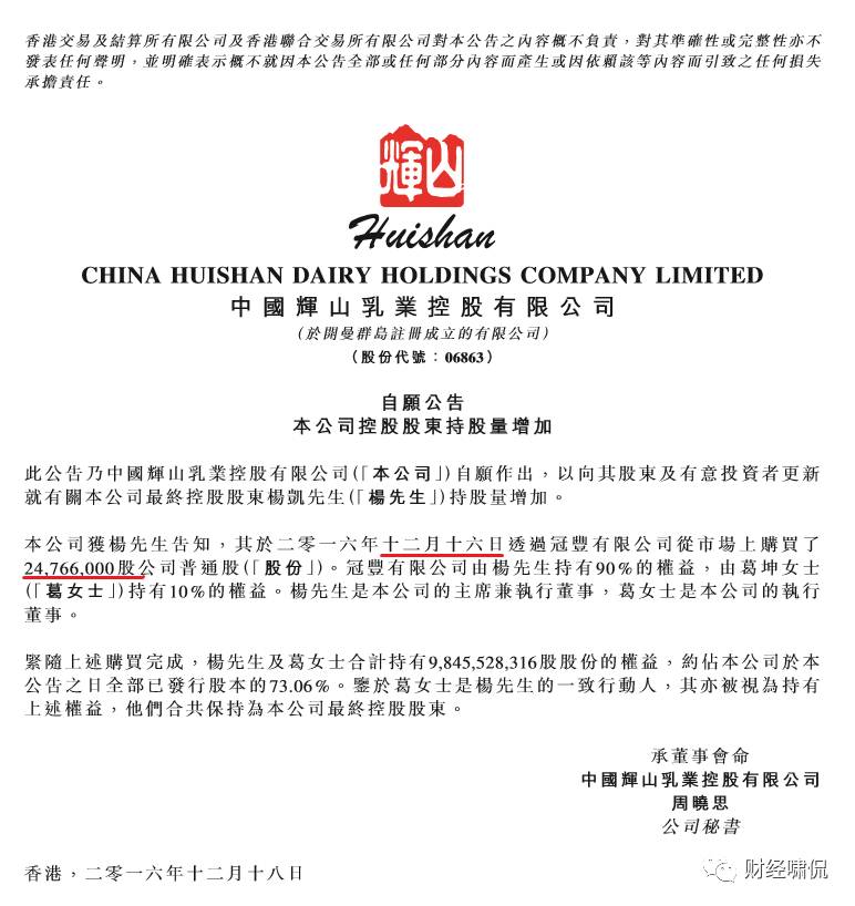 12月19日,辉山乳业再度发布公告,杨凯先生于12月19日又透过冠丰有限公司从市场上购买了2106.7万股辉山乳业股份。