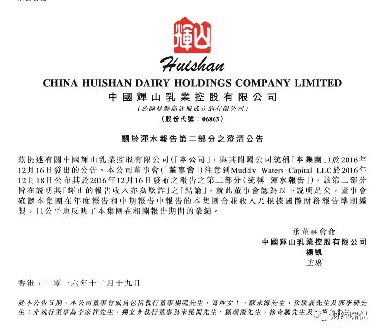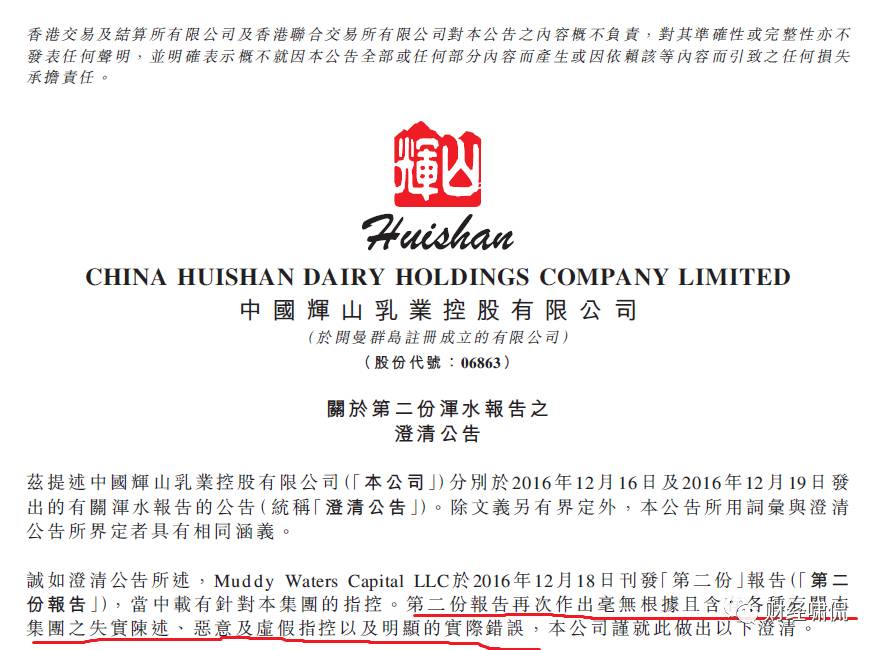 对此,辉山乳业在12月19日深夜第三次发布澄清公告,针对上述指责一一进行反驳,并称浑水第二份做空报告再次作出毫无根据且含有各种有关公司之失实陈述、恶意及虚假指控以及明显的实际错误。