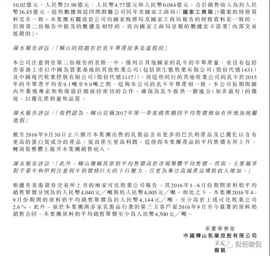 针对上述指责,辉山乳业在公告中表示,根据在香港证券交易所上市的两家可比牧业公司报告,其2016年1-6月期间原料奶平均销售单价分别约为4040元/吨和4005元/吨;相比之下,公司2016年4-9月期间的原料奶平均销售单价约为4144元/吨,至少高于上述可比牧业公司2.6%。