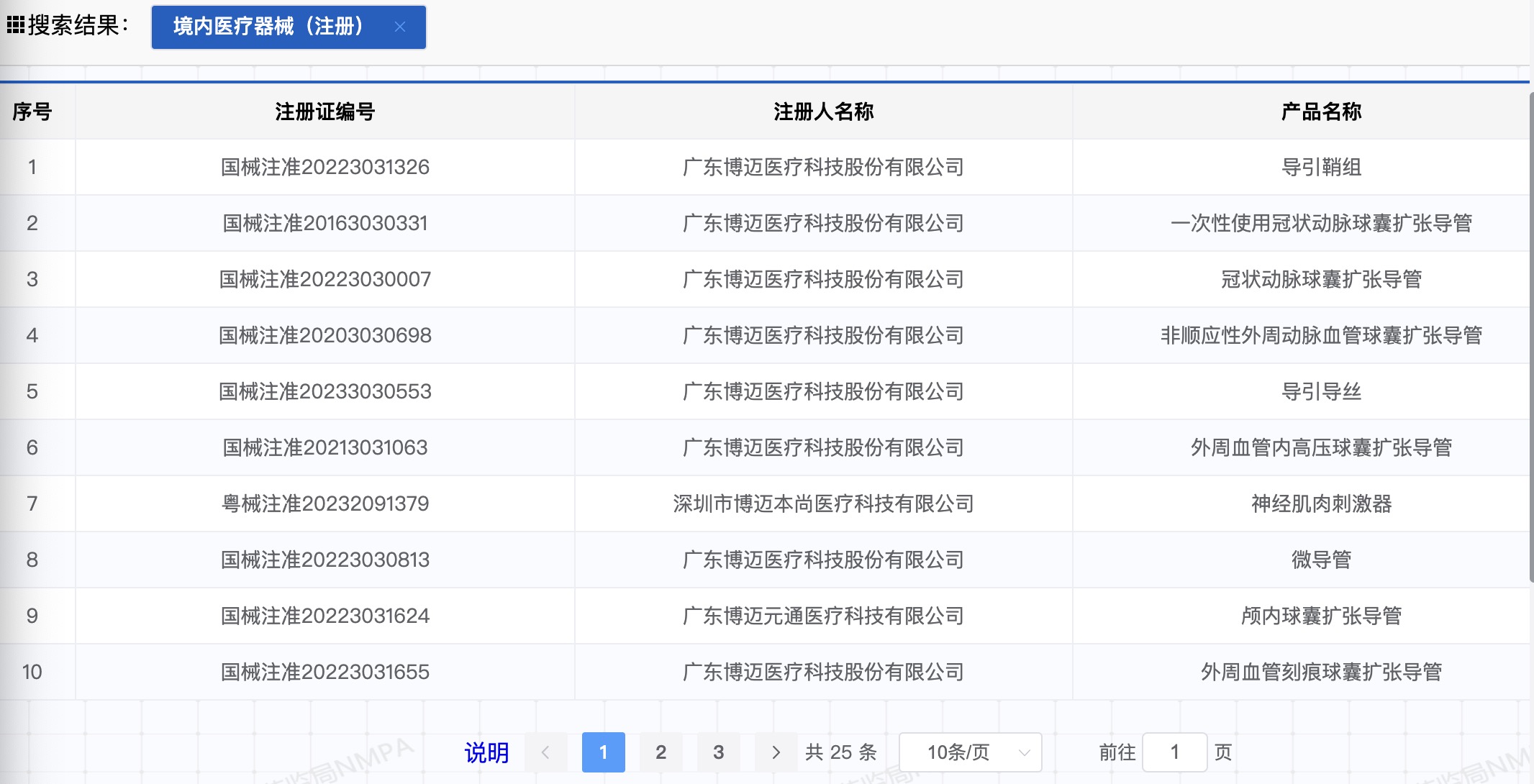 据界面新闻查询国家药品监督管理局的信息,博迈医疗有25款产品获批,包括颅内球囊扩张导管、外周血管刻痕球囊扩张导管、外周血管内高压球囊扩张导管等。