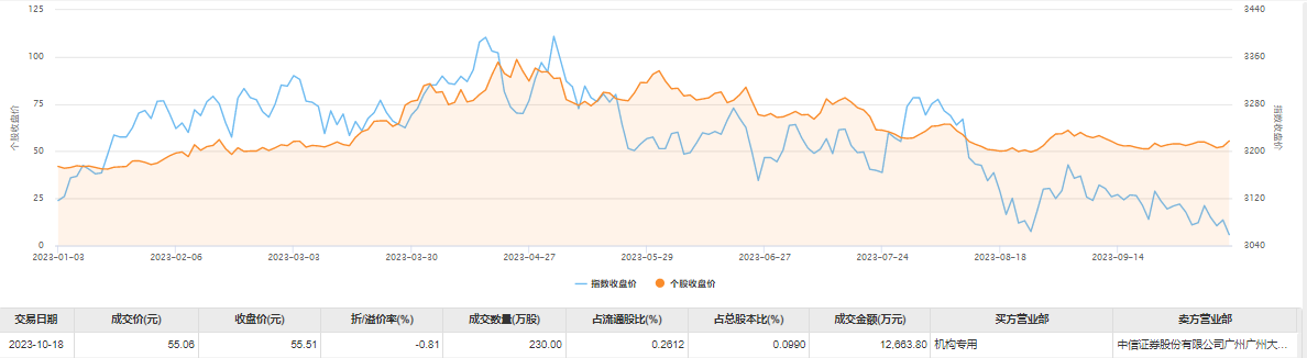 10月18日,海光信息今日大宗交易成交230万股,成交额1.27亿元,占当日总成交额的4.4%,成交价55.06元,较市场收盘价折价0.81%。