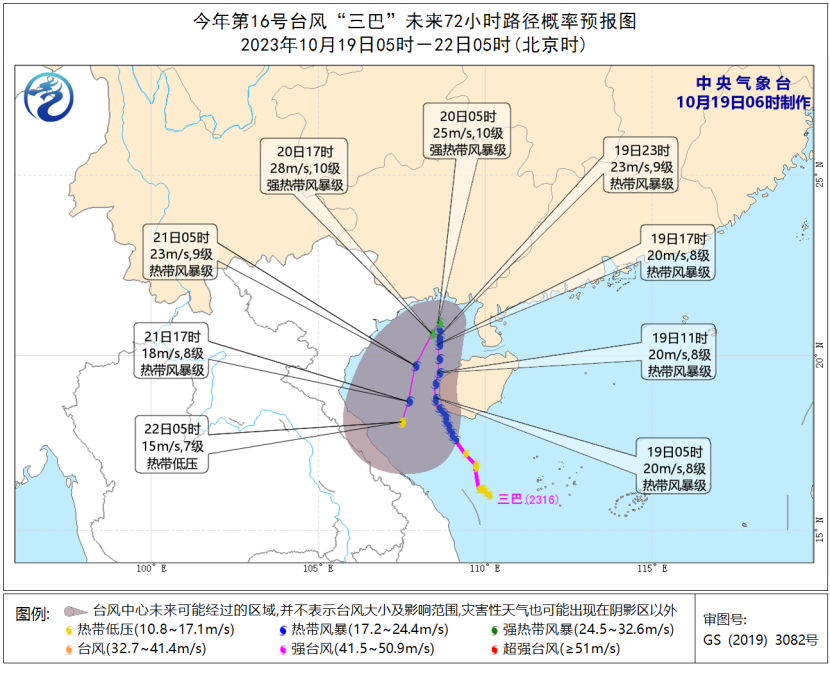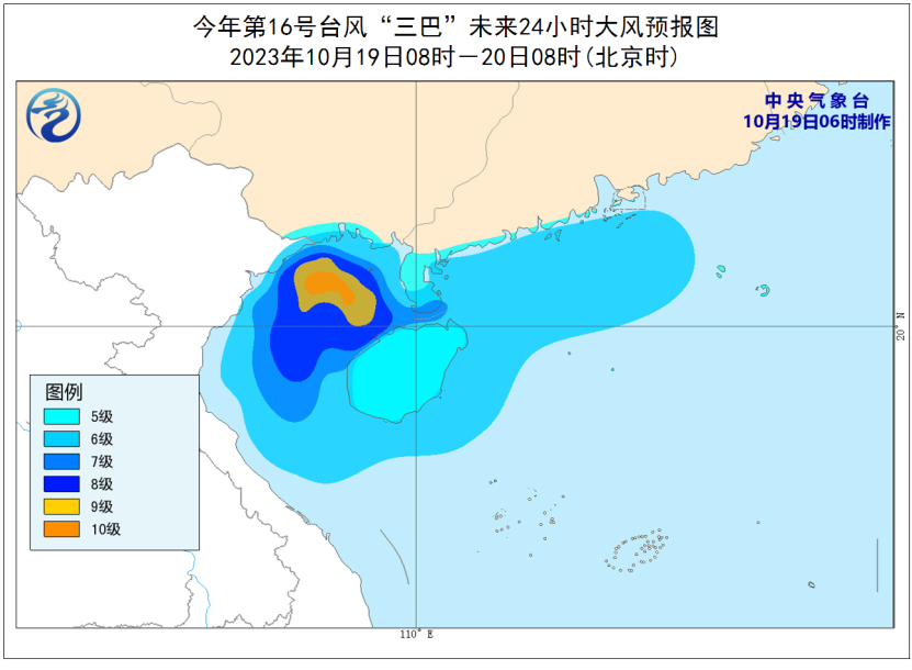 大风预报:19日08时至20日08时,南海北部和中西部、北部湾、琼州海峡、广东沿海、广西沿海、海南岛沿海将有5-7级风,台风中心经过的部分海域风力可达8-10级、阵风11-12级。