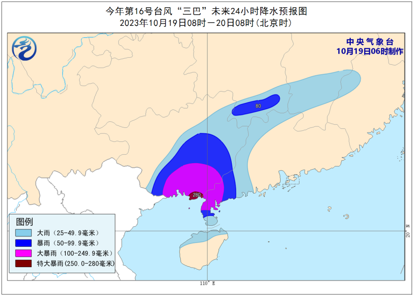 中央气象台10月19日06时继续发布台风蓝色预警:今年第16号台风“三巴”(热带风暴级)的中心今天(19日)早晨5点钟位于海南省东方市近海,就是北纬18.8度、东经108.5度,中心附近最大风力有8级(20米/秒),中心最低气压为998百帕,七级风圈半径80-120公里。