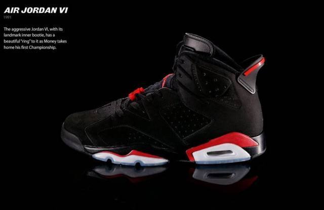 1. 第七位:Air Jordan VI Air Jordan VI 第一次发售是在1991年,迈克尔·乔丹在联盟效力七年之后,终于带领芝加哥公牛队首次杀入NBA总决赛,并以4-1的辉煌战绩挫败魔术师约翰逊领衔的洛杉矶湖人队。当时,乔丹正是穿着这双球鞋拿到了职业生涯的第一个总冠军。设计方面,Air Jordan VI 中底延续了前几代产品的可见式AirSole气垫,鞋舌中央有一个耀眼漂亮的飞人标识,加上鞋子的创新流线外形,Air Jordan VI 显得很是精巧。