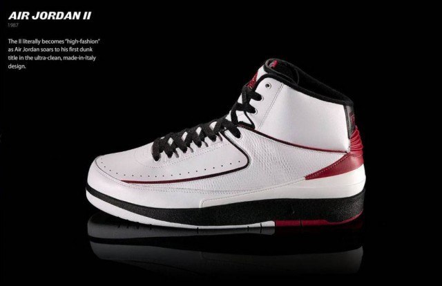 2. 第六位:Air Jordan II 生涯第二个赛季,乔丹身穿这双Air Jordan II 完成了许多前所未有的漂亮暴扣。当时,如果只看球鞋侧面,人们很难相信这是耐克产的鞋子——自1972年耐克公司成立以来,所生产的球鞋侧边几乎都是清一色的大勾,即便是Air Jordan I 也不例外。而Air Jordan II 不仅取消了鞋身的对勾,并将飞人专属的飞翼标识放在最醒目的鞋舌部位。淡化耐克品牌形象,强调乔丹个人色彩,从那时起,耐克就已经着手塑造一个全新独立品牌。