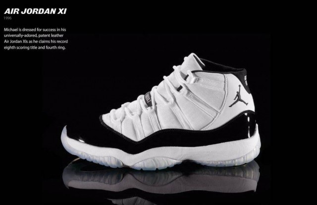 7. 第一位:Air Jordan XI Air Jordan XI 是乔丹征战1995-1996赛季的战靴,它突破性地采用漆皮作为鞋面材料,球鞋的外底采用水晶橡胶,中底采用全掌碳素纤维承托板,同时搭载了全掌内置Air Sole气垫——这一切,使其成为篮球鞋发展史上重要的里程碑。不仅于此,当赛季乔丹复出,带领公牛队获得了创纪录的常规赛72场胜利,乔丹第八次获得常规赛得分王,第四次夺得NBA总冠军,飞人还包揽了当赛季的三项MVP称号。一系列的荣誉,都给Air Jordan XI 戴上了神一般的光环,被称为“具有灵魂的球鞋”。