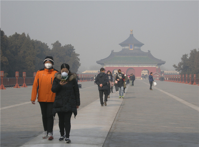 8. 中外游客戴口罩在雾霾中游览天坛公园。当日京城空气质量达重度至严重污染。