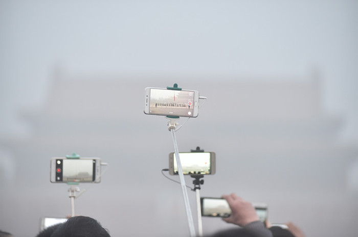 10. 游客用手机拍摄升旗仪式。