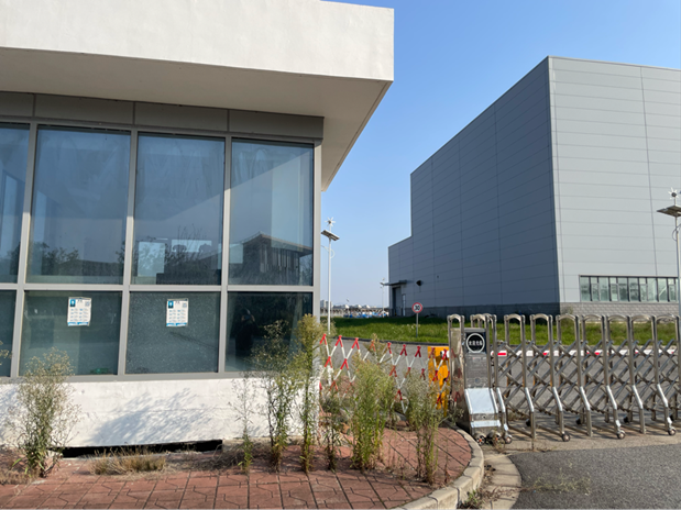 虽然工厂停摆,但还有少量员工在宿舍坚守,只是物业服务已经接近于零。工厂对面一排六七层楼高的白色建筑是员工宿舍,大门敞开,无人看守,可以任意出入,但很少有人进出,只有环卫工人偶尔来运走门口的垃圾。一楼室外配有足球场、篮球场,因长时间无人使用,外围已经长满一人高的杂草。
