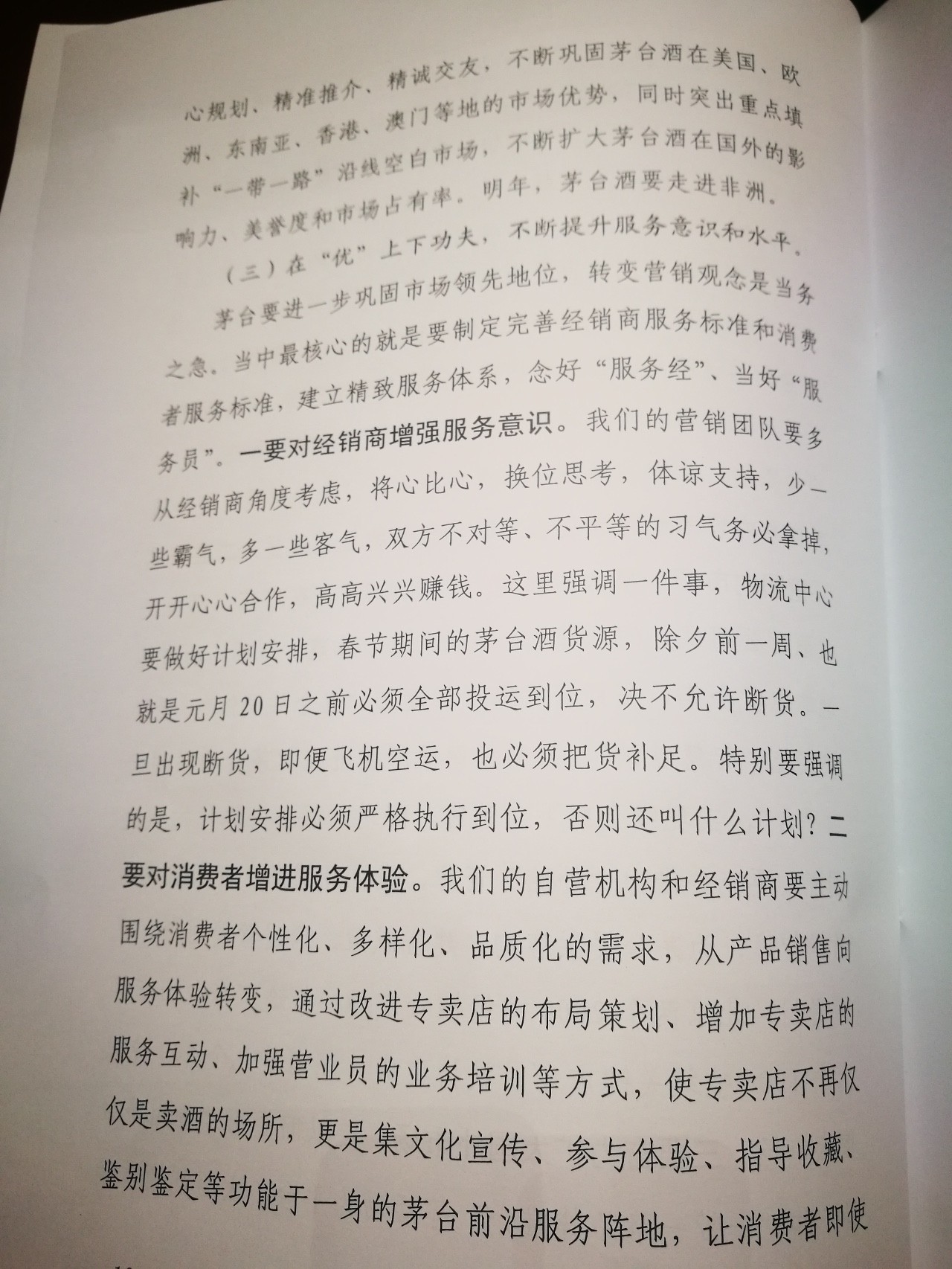 6、强化“智慧营销”落地,加速推进精准营销。加大工作力度,推动经销商深度进入“茅台物联网云商平台”,强化“智慧营销”落地,实现经销、网点、产品、用户和信息的整合能力,达到线上线下对销售、配送、服务一体化的快速调配。加快新技术的应用,制作“茅台酒产品销售手册”数据版,运用新媒体展示茅台酒全系产品“家谱”,便于公司辨识公司产品;加大新媒体展示的精准投放,契合年轻群体的消费需求;为经销商制化个性化APP,提升信息和资源的应用开发能力。
