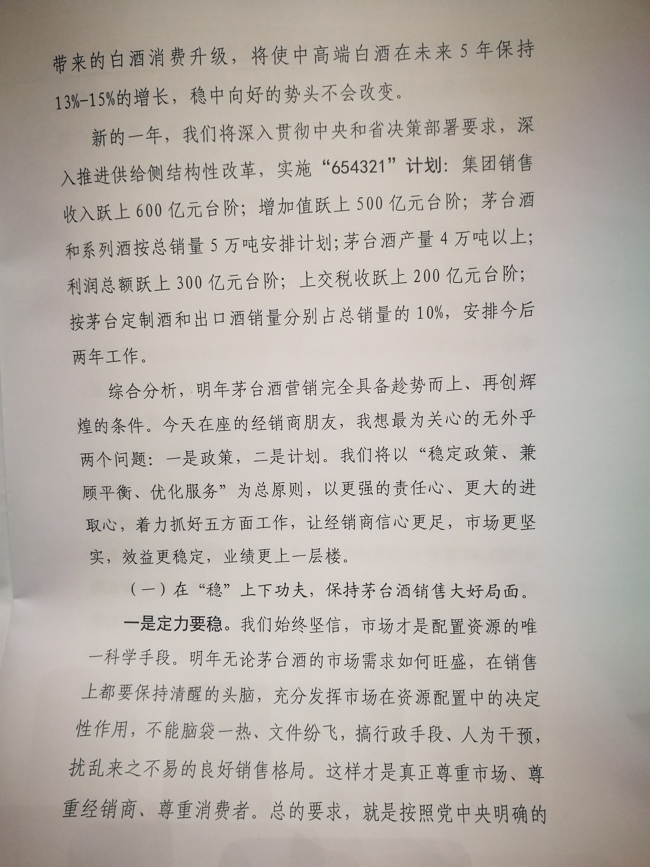新的一年,深入推进供给侧结构性改革,实施654321计划,集团销售收入跃上600亿元台阶,增加值跃上500亿元台阶,茅台酒和系列酒按总销量5万吨安排计划,茅台酒产量在4万吨以上,利润总额跃上300亿元台阶,上缴税收跃上200亿元台阶,按茅台定制酒和出口酒销量分别占总销量的10%,安排今后两年工作。