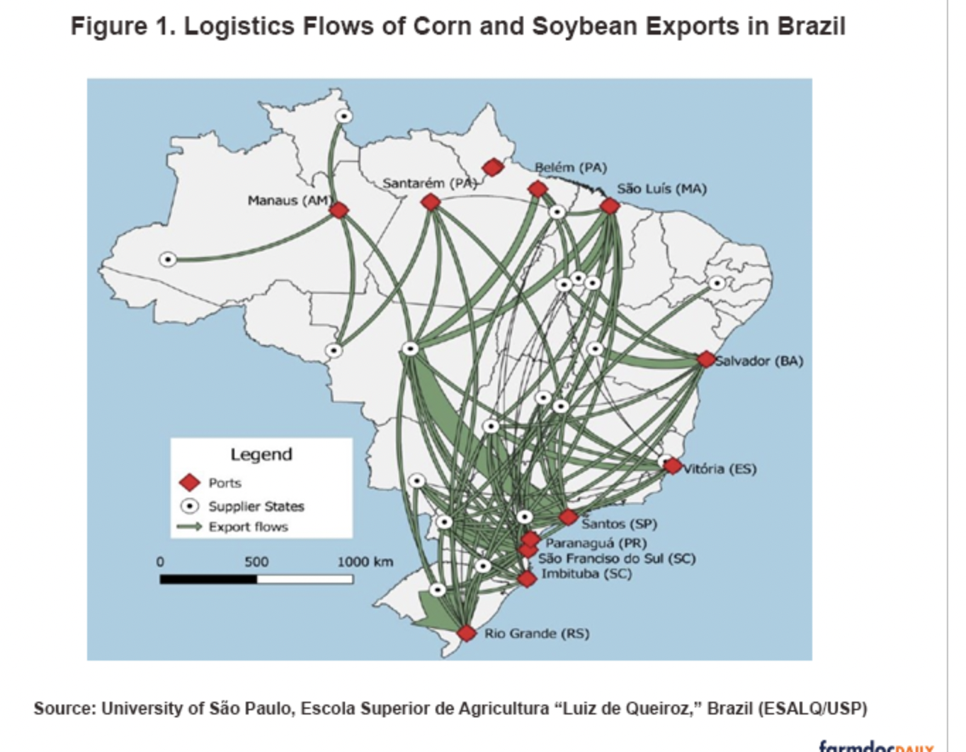 巴西大豆和玉米出口传统上依赖南部和东南部港口,主要通过长途卡车在主产区和南部港口间进行货物运输。但是在过去十年,巴西又开拓了亚马孙地区所在的北部出口路线,它主要通过亚马孙河流的水路将谷物运往马瑙斯等主要港口,这进一步增强了这个南美谷物出口大国的竞争力。