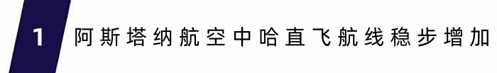随着国际旅游业的逐渐复苏,阿斯塔纳航空(Air Astana)中哈直飞航线运力也稳步提升。目前北京至阿斯塔纳往返航线每周运营1班。北京至阿拉木图往返航线每周运营6班。另外2023年10月29日起,乌鲁木齐至阿拉木图的往返直飞航线也将正式复航,每周运营2班,未来航班将逐渐增加至每周运营7班。此外,阿斯塔纳航空集团全资子公司低成本航空FlyArystan运营的乌鲁木齐至阿斯塔纳往返直飞航线也已于2023年9月21日起开始执飞,每周2班,以更优惠的价格带来舒适的飞行体验。