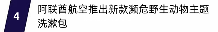 近日,阿联酋航空表示将面向豪华经济舱和经济舱乘客在全球长途航班上免费提供全新洗漱包。这套洗漱包由阿联酋航空与野生动物保护联盟(UFW)携手设计,体现出阿联酋航空在致力提高人们对濒危物种的关注和阻止野生动物及野生动物产品非法贸易方面所做的努力。洗漱包包身和附赠书签上的动物形象是全球部分遭受严重非法贩卖的野生动物,包括:绿海龟、非洲象、蓝金刚鹦鹉、大猩猩、双髻鲨、狮子、穿山甲和黑犀牛。洗漱包由可重复使用的可水洗牛皮纸制成,包上装饰着使用无毒大豆油墨印刷的定制动物图案。套装内的长途旅行必备品采用环保材料制成以减少原生塑料的使用。其中,洗漱包内牙刷由小麦秸秆和塑料混合制成,袜子和眼罩由再生塑料rPET(再生聚对苯二甲酸乙二醇酯)制成。此外,因得到乘客的广泛欢迎,阿联酋航空还计划在今年年底逐步将耳塞重新纳入洗漱包之中。