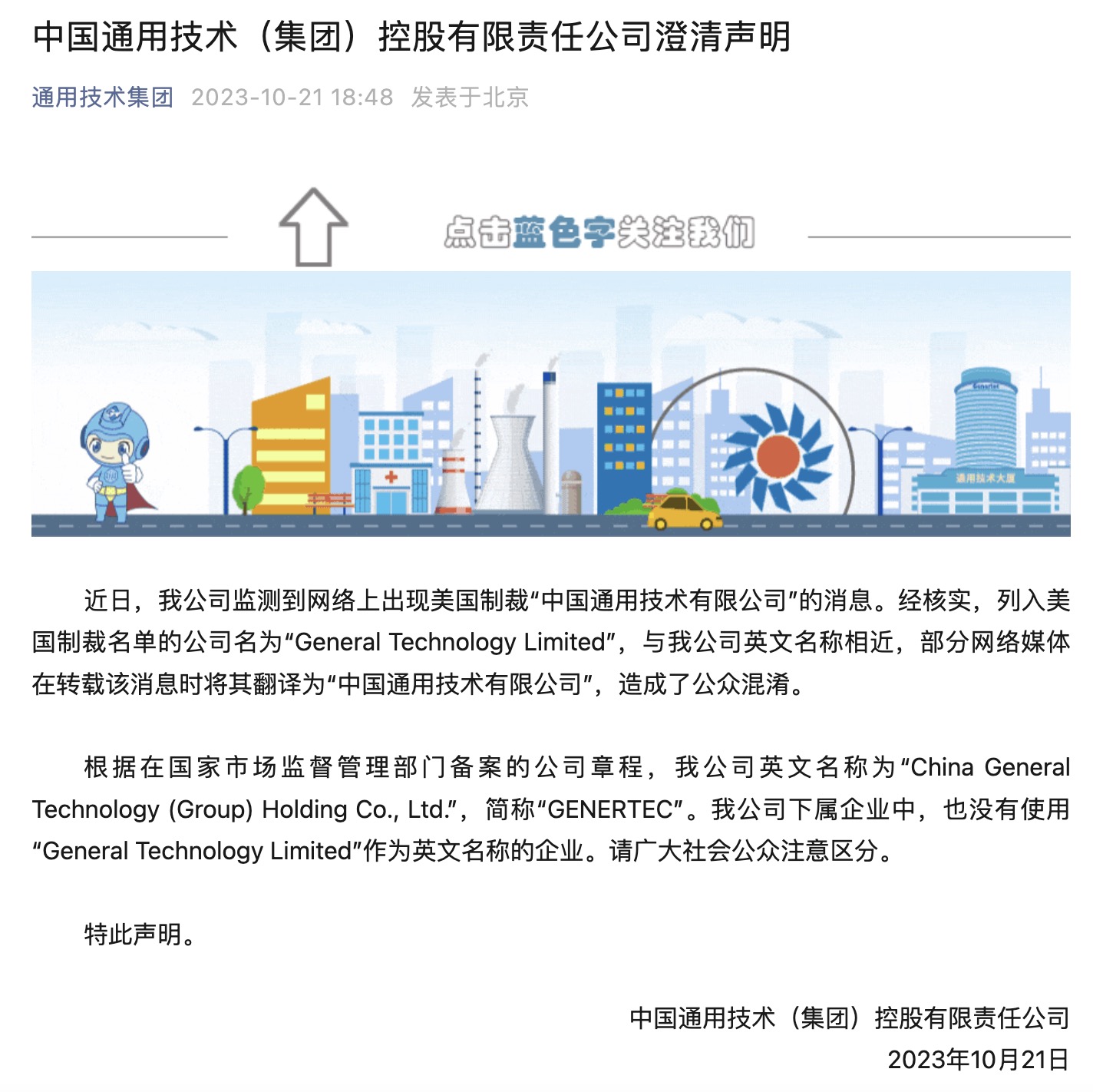 10月21日,中国通用技术(集团)控股有限责任公司发布澄清声明称,近日,我公司监测到网络上出现美国制裁“中国通用技术有限公司”的消息。经核实,列入美国制裁名单的公司名为“General Technology Limited”,与我公司英文名称相近,部分网络媒体在转载该消息时将其翻译为“中国通用技术有限公司”,造成了公众混淆。