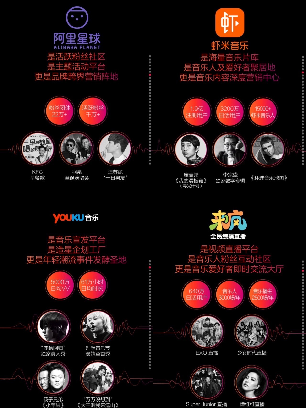根据一组公开数据显示,以优酷为代表的视频平台,拥有的月覆盖用户数超5.8亿、日均PV达 5000万;以来疯为代表的视频直播平台,拥有640万日活用户,音乐人直播超3000场;以虾米音乐为代表的音乐播放平台,注册用户达到1.9亿、日活用户3200万、音乐人数量超过15000组;以阿里星球为代表的活跃粉丝社区,粉丝团体超过22万、活跃粉丝更是千万级别。虽然这数以亿计的用户并不等同于音乐的付费群体,但背靠阿里大文娱的阿里音乐究竟能给音乐行业带来多大的市场价值,同样让人期待。