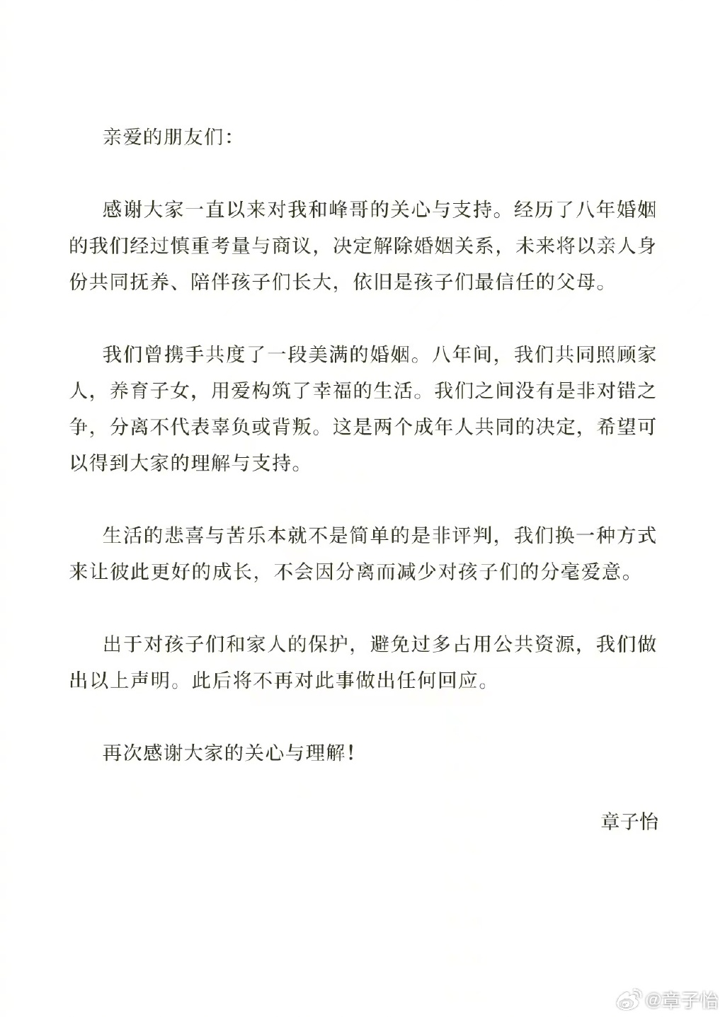 稍晚,章子怡和汪峰二人发布共同声明称,“经历了八年婚姻的我们经过慎重考量与商议,决定解除婚姻关系,未来将以亲人身份共同抚养、陪伴孩子们长大,依旧是孩子们最信任的父母。”