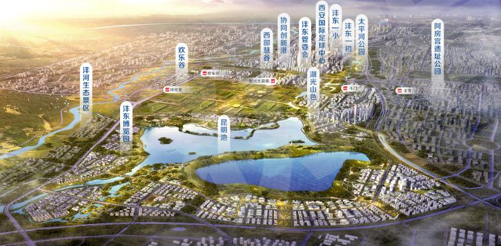 其中包含以西安医学院第一附属医院沣东院区、陕西省中医药研究院等高水平医疗资源;以西安高新一中沣东中学、沣东一小、沣东实验小学为主的优质教育资源;以及以昆明池·七夕公园、诗经里小镇、周文化博物馆、欢乐谷等为一体的文旅资源,大大的提升了区域发展能级,优化区域的公共服务配套。