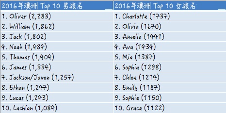 很显然,过去的一年里有很多奇葩父母为孩子取千奇百怪的名字才促使维州政府不得不下令禁止这些名字,但也有不少父母给孩子起的是最常见和普通的名字。澳洲2016年最受欢迎的新生儿名字已经揭晓,女孩的名字很显然受到了最小的皇室宝宝夏洛特公主的影响,她的名字在澳洲最受欢迎。今年共有1737个澳洲宝宝被命名为夏洛特,打败了连续三年统治王位的Olivia,后者今年屈居第二。而Oliver则连续第三年名列最受欢迎的男孩名,这个名字不但在全澳居首,也是六个州家长的首选。具体排名如下: