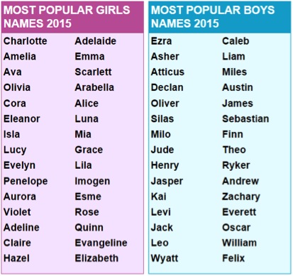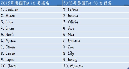名字也有入时和过时之分,很多家长不见得给孩子取最流行的名字,但多少都不想让自己孩子的名字听起来老气又过时。去年美国刮起了一阵用互联网上的热词起名,比如Lux, Juno和Amaro都是全球知名照片分享社区Instagram里滤镜的名称。也有越来越多的家长开始给女孩起比较中性的名字,如Piper, Riley ...这些都是传统的男孩名字。截止到2015年美国最流行的新生儿名字如下:
