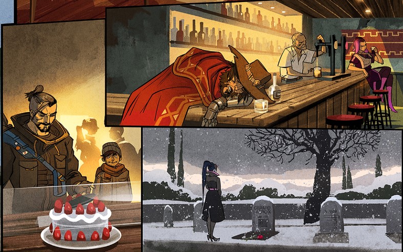 不过,仍然有几名英雄形单影只。不知为谁送上祝福的半藏,独自醉倒在酒馆的麦克雷,哀悼亡夫的黑百合和隐匿在黑影中的死神。