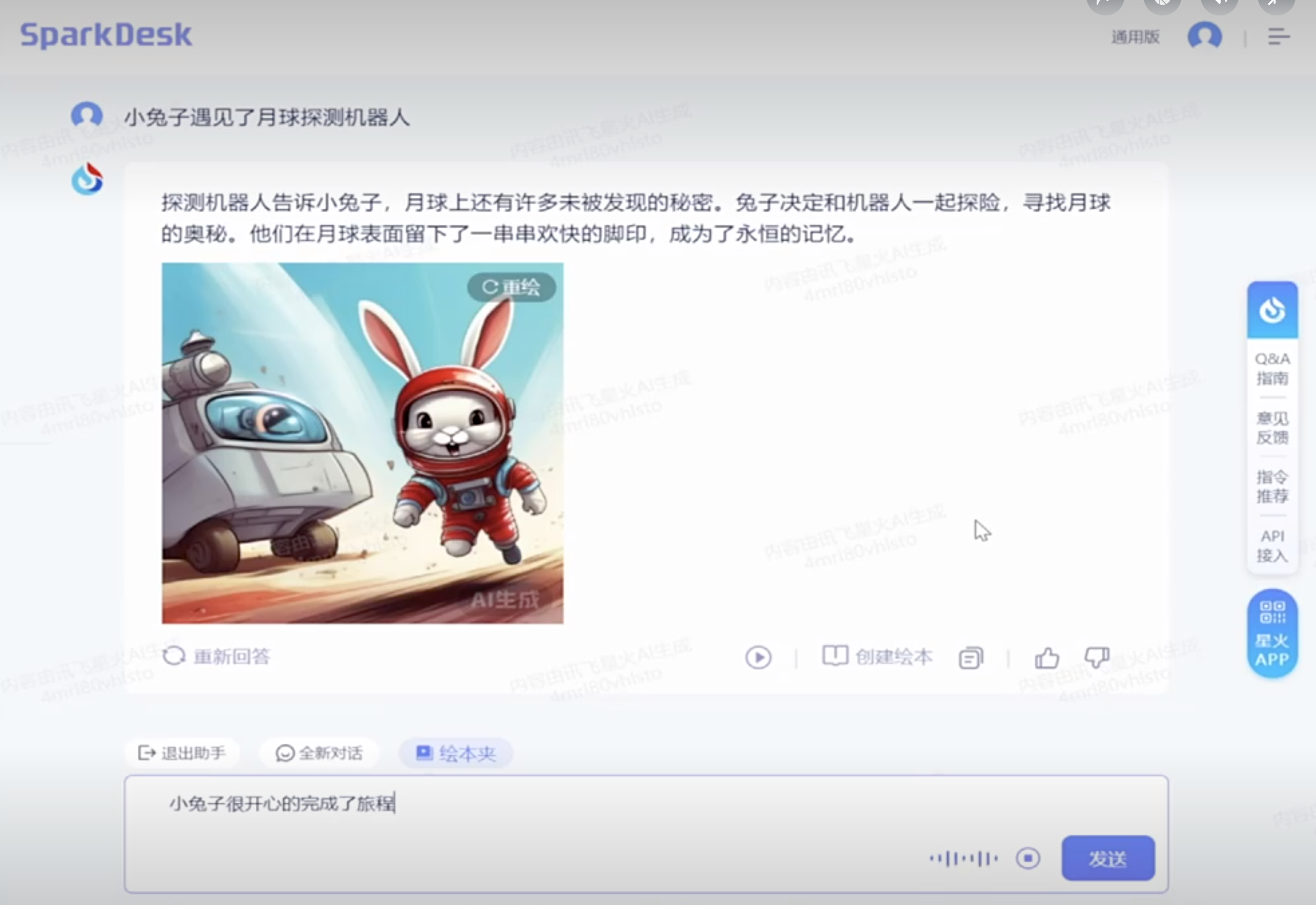在现场演示环节,科大讯飞研究院院长刘聪演示了有声绘本创作助手功能,他以“小兔子去太空”为主题使用星火认知大模型V3.0现场绘制了相关绘本内容。在这一应用案例中,大模型既要保证上下文连续性,还需保证图像内容中主角的一致性,刘聪借此展示了大模型的多模态及多轮对话能力。