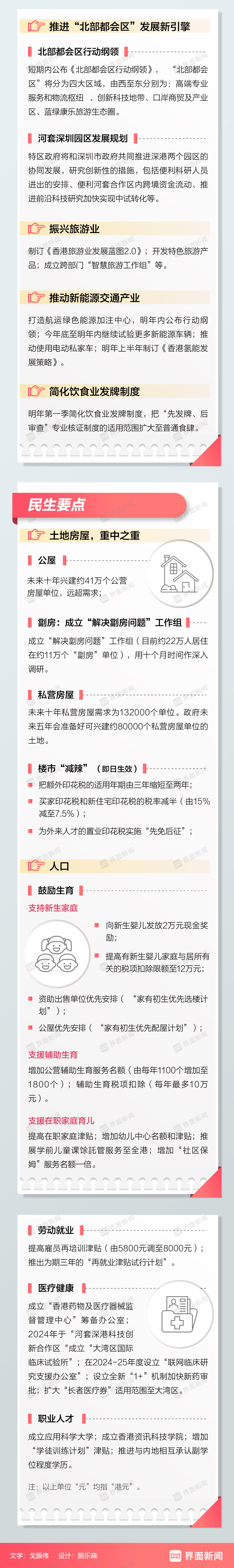 10月25日,香港特区行政长官李家超发表任内第二份施政报告,今年施政报告的主题是“拼经济谋发展、惠民生添幸福”,界面新闻大湾区频道记者就报告涉及的经济、民生相关要点摘编如下: