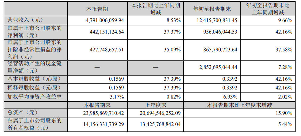 具体来看,三季度实现营业收入47.91亿元,同比增长8.53%;实现净利润4.42亿元,同比增长37.37%。