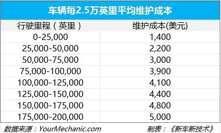 为什么10万英里之后的车辆维护费用不再大幅上涨了呢?是因为这个时候一辆车的正常维护到5000美元左右已经接近封顶,各种损耗件与易损零件基本上都能被5000美元的费用下覆盖。另外,一旦这个时候汽车的发动机或变速箱等大件出现问题需要更换,且更换费用已经接近购置一款新车时,也就到了换车的时候了。