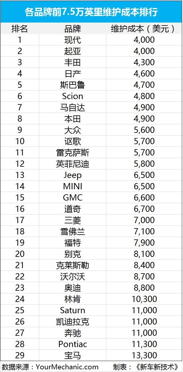英菲尼迪之后的13-20名之间,除了MINI和三菱之外均为美系品牌,至第20名别克,前7.5万英里的维护成本已经增长到了8000美元以上,较现代、起亚及丰田等品牌多出一倍。
