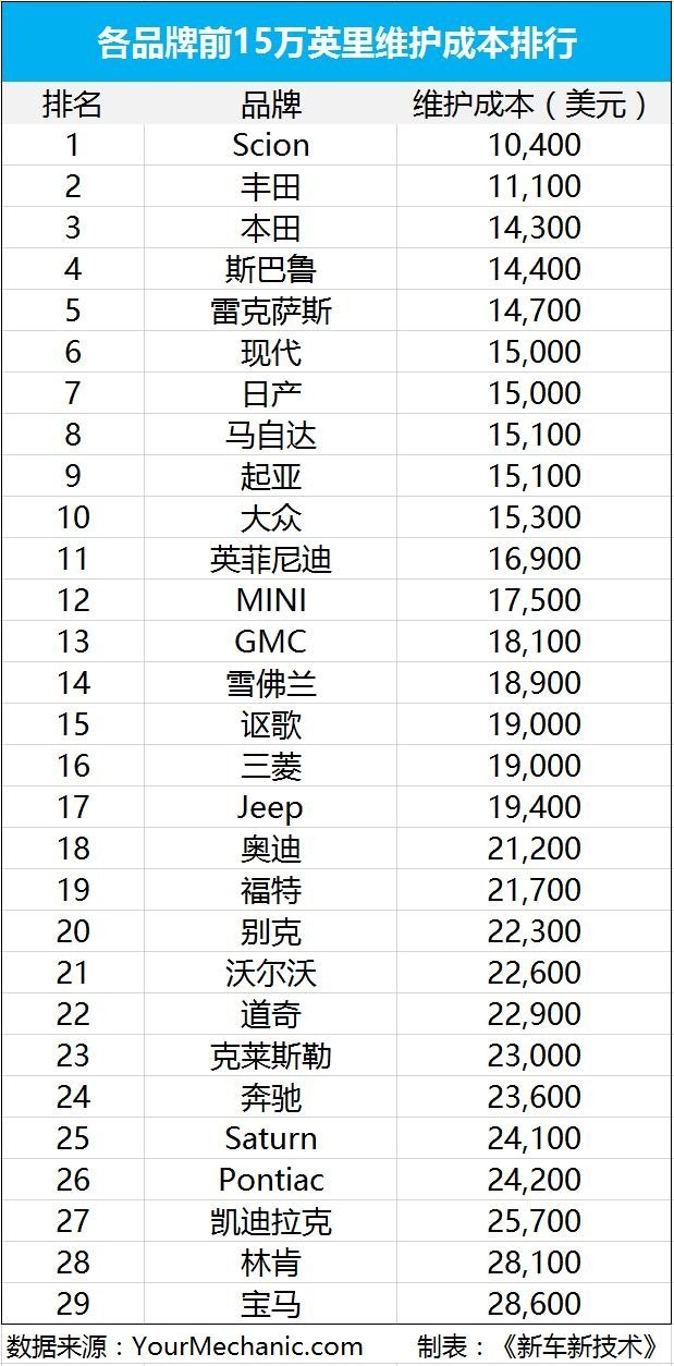 10名之后,美系品牌大多仍处于中游位置,奥迪则超越沃尔沃,成为日系之外维护成本最低的豪华品牌。最不省钱的最后三名,分别为凯迪拉克、林肯和宝马,宝马的平均维护成本高达28,600美元,几乎相当于Scion和丰田的三倍,要知道在美国花3万美元,已经能买一辆豪华品牌的入门车了,此时我们不禁要问,这么多的维护费用到底都花哪儿了?