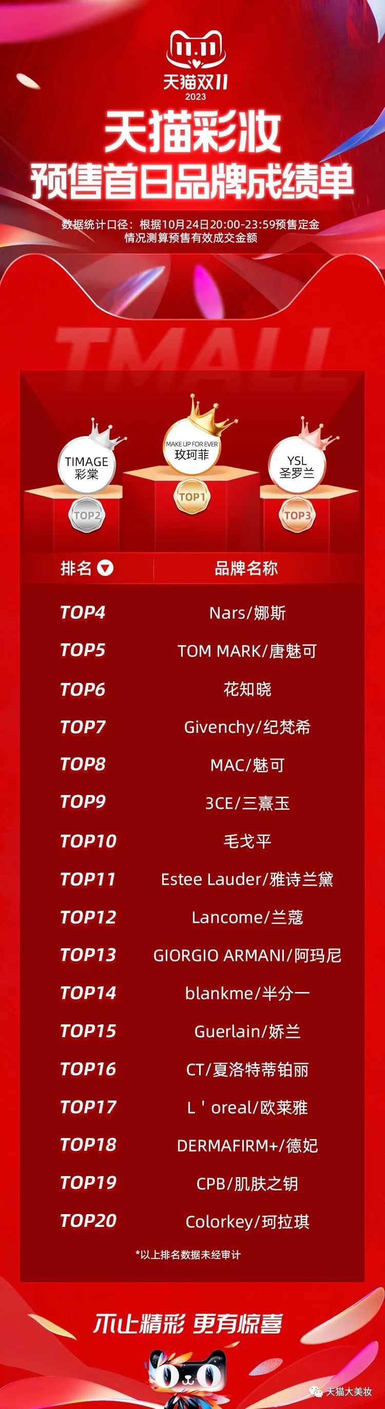 虽然完美日记和花西子曾作为国货彩妆的头部代表却不再现于榜单,但还是有一些后起之秀在持续发力。比如,花知晓此次冲到了天猫彩妆预售首日的第6名,国货高端彩妆毛戈平、以粉底为特色blankme半分一,以及专精于唇釉的Colorkey珂拉琪则分别位列第10、14和20名。