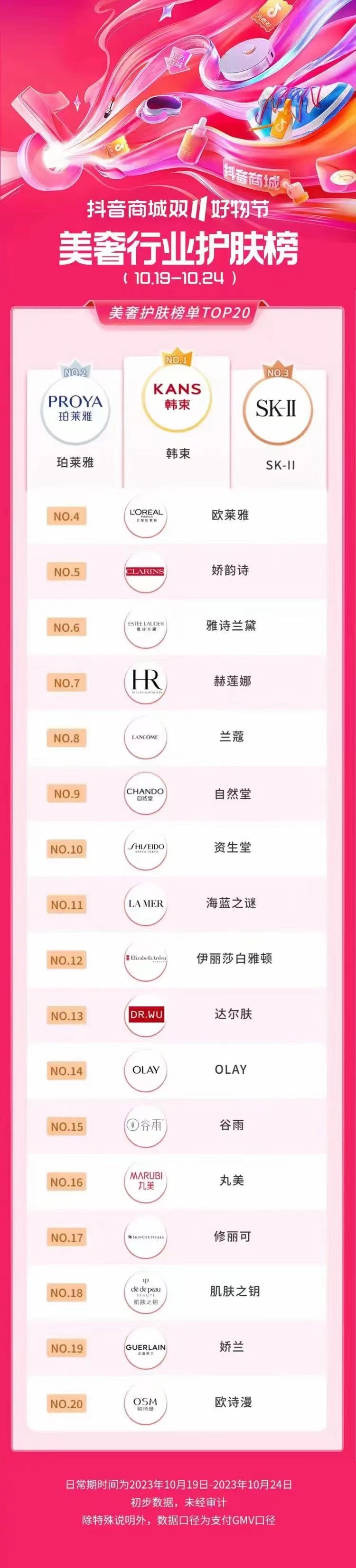 在抖音商城双11好物节的10月19日至24日期间,珀莱雅GMV排在美奢行业护肤榜单的第二名,彩棠则位列美奢行业彩妆榜单的第一名。