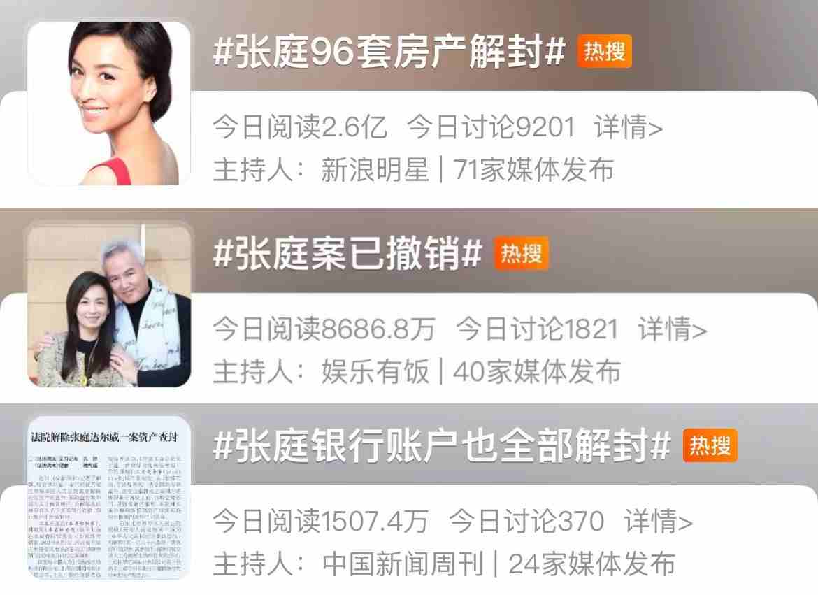 10月26日,据《法治日报·法治周末》报道,张庭(本名张淑琴)、林瑞阳(本名林吉荣)旗下上海达尔威贸易有限公司涉网络传销案已被石家庄市裕华区人民法院撤销。消息经传出后,“张庭96套房产解封”“张庭银行账户也全部解封”等词条随即冲上微博热搜,引发网民热议。