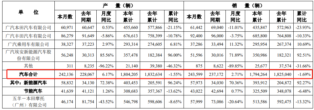 产销快报显示,今年前三季度广汽集团合计生产汽车180.42万辆,同比下滑1.55%;合计销售汽车179.43万辆,同比下滑1.69%。