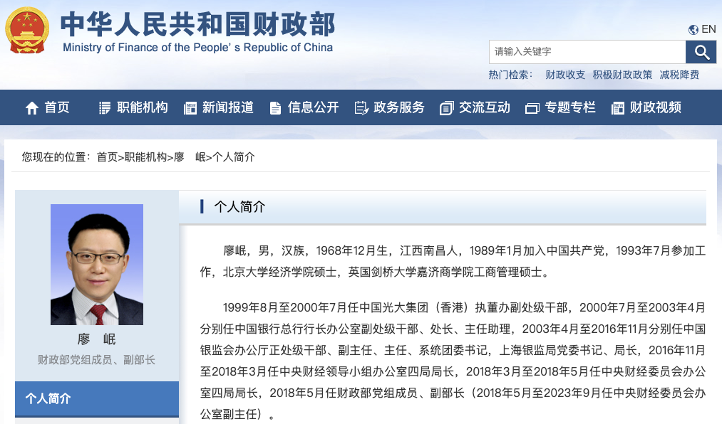 财政部网站“职能机构”栏目近日更新后显示,财政部党组成员、副部长廖岷自今年10月起不再担任中央财经委员会办公室副主任。