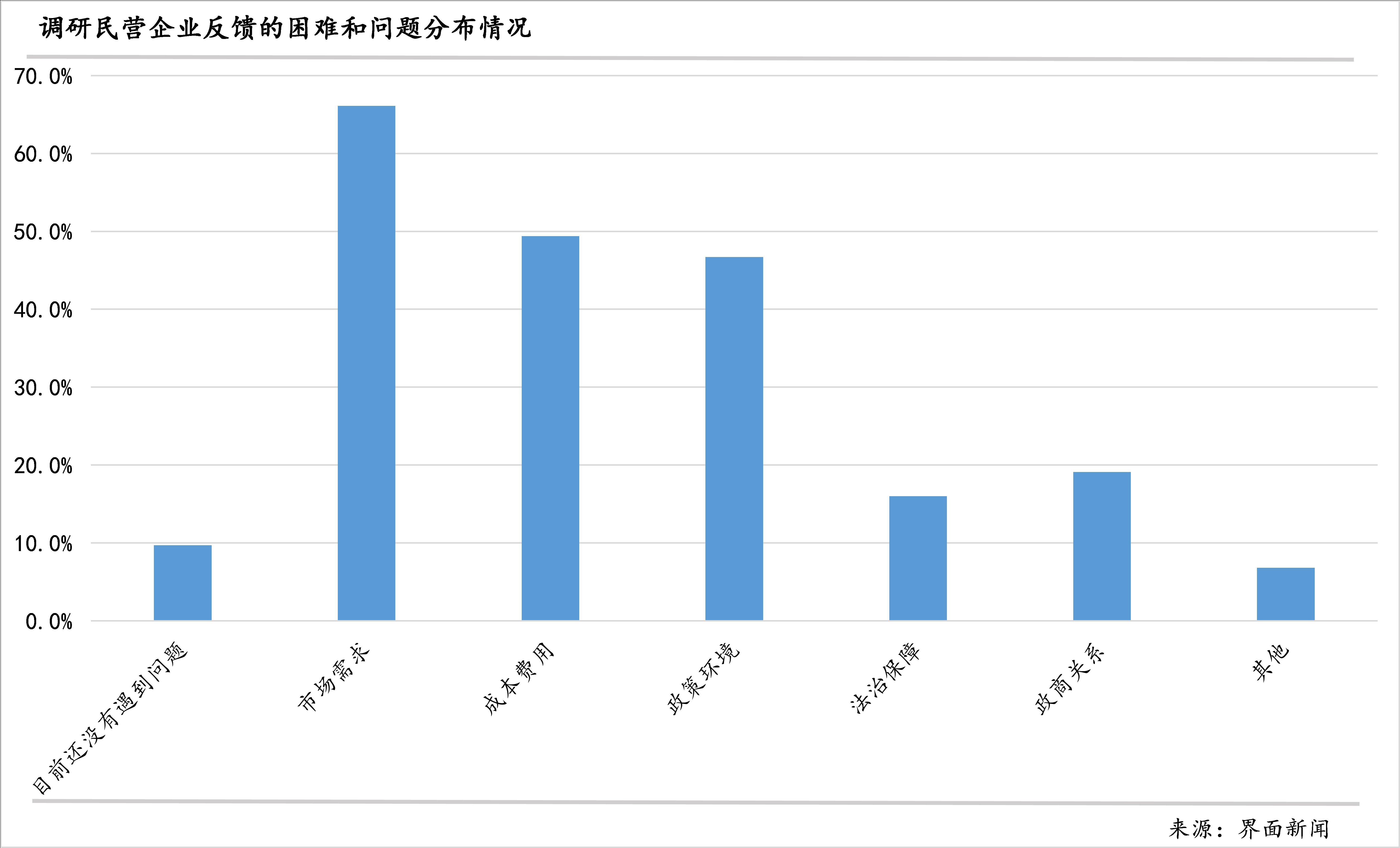 3、市场需求不足是民营企业面临的最大问题:调研显示,民营企业面临的最大问题是市场需求不足,有66.1%的企业反映了这一点,成本费用和政策环境次之,占比分别为49.4%和46.7%;政商关系和法治保障方面则分别有19.1%和16%的企业认为还需要进一步改进。
