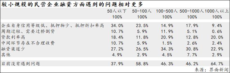 4、较小规模民营企业在融资方面遇到的困难更大:50人以下企业目前不存在融资问题的占比仅为38%,其他规模企业的比例则显著抬升(46%-65%)。具体来看,存在自身信用等级低、抵押物少、抵押折扣率高等问题的,在50人以下企业中占比逾三分之一,50-100人企业中占比23.5%,其他三种规模都不足18%,其中1000人以上占比最低。