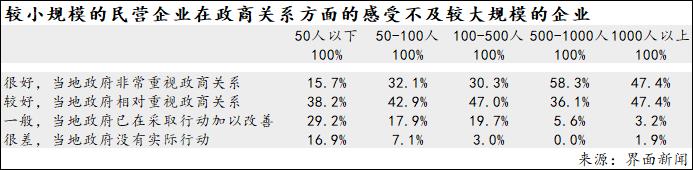 5、较小规模民营企业对政商关系的满意度相对较低:认为当地政商关系很好且当地政府非常重视的,在500-1000人规模的企业中占比最高,在1000人以上规模中的占比次之,在50人以下企业中占比显著低于其他规模的企业,仅为15.7%。认为当地政商关系很差且当地政府没有采取实际行动的企业,在500-1000人与1000人以上规模的企业中占比最低,在50人以下规模其中保持这种看法的企业占比显著上升,达到16.9%。