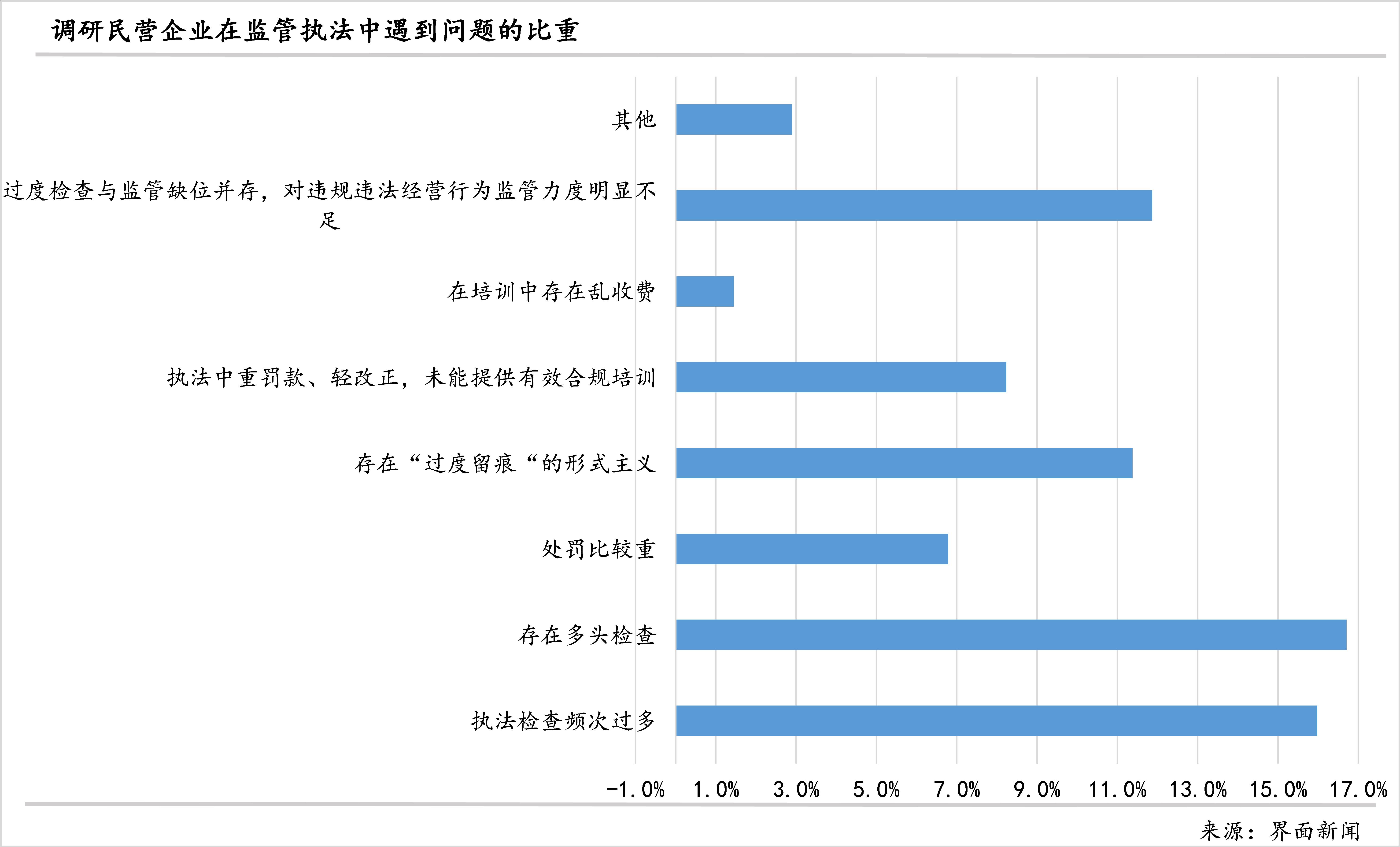 7、多头检查和频次过多是民营企业面临的主要监管执法问题:对于监管执法,认为存在多头检查的企业占比最高(16.7%),认为执法检查频次过多的企业占比次之(16.0%),认为过度检查与监管缺位并存、对违规违法经营行为监管力度明显不足的占比11.9%,认为存在“过度留痕”的形式主义问题的占比11.4%。