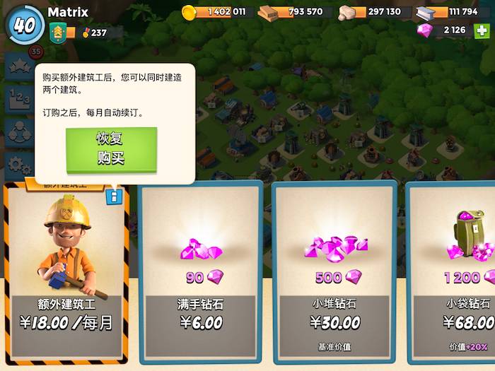 12月12日,Supercell的《海岛奇兵》进行了一轮更新,虽然这次更新的内容不多,但是却带来了一次很重要的改变——增加额外建筑工。这意味着,《海岛奇兵》的升级时间可以大幅度减少,因为在这之前,海岛里面只有1个建筑工,所有的建筑升级只能依靠这一个建筑工。不过更有趣的是,在此次新增的建筑工的收费模式并未使用一次性买断的模式,而是包月订购,每个月18元,如果当月不取消,下月自动续费。那么这次的更新到底说明了什么问题呢?