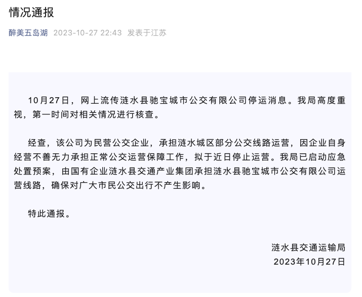 江苏涟水县交通运输局通报,10月27日,网传涟水县驰宝城市公交有限公司停运消息。经查,该公司为民营公交企业,承担涟水城区部分公交线路运营,因企业自身经营不善无力承担正常公交运营保障工作,拟于近日停止运营。该局已启动应急处置预案,由国有企业涟水县交通产业集团承担涟水县驰宝城市公交有限公司运营线路,确保对广大市民公交出行不产生影响。