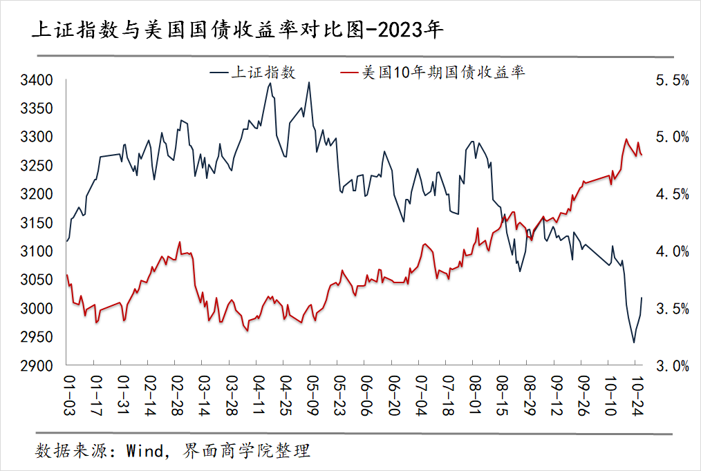 从逻辑上分析,美债收益率与A股市场存在一定的关系。一方面美债收益率上升,意味着债券市场的回报率提高,资金可能从股票市场流向债券市场,对股票市场形成一定的资金压力。其次,从估值的角度看,美债收益率上升,也代表全球基础利率的上升。这将导致折现率提升,对权益市场的估值形成压力。从情绪的角度看,美债收益率的持续上行可能引发全球投资者的担忧,对全球经济和金融市场产生影响,从而影响A股市场的投资者情绪。